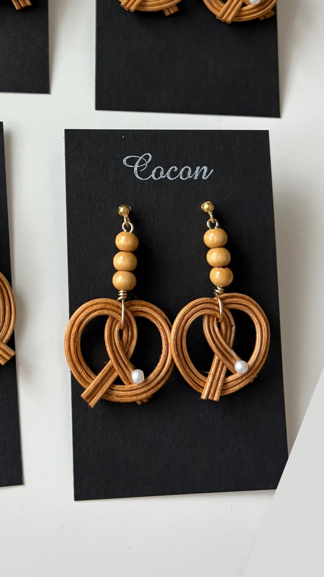 リボン帽子ピアス、イヤリング 天然素材のラタンを使用して作られたミニ帽子デザインのピアスとイヤリング。ブラックのリボンをつけて可愛らしさと華やかさをプラスしています。 どんな装いにもぴったりと映え、特別なアクセントとなること間違いなし!デイリーユースはもちろん、特別な日にもおすすめできるアイテムです。 天然素材ならではの温もりを感じながら、おしゃれを楽しんで下さいね。 【サイズ】 ラタン部分:約3.5cm リボン部分:本革 全長:約5cm 片耳のみ ナチュラルな質感と可愛らしいデザインが魅力です。 ※手作りのため、サイズや形状、色に若干の差異が生じることがございます。